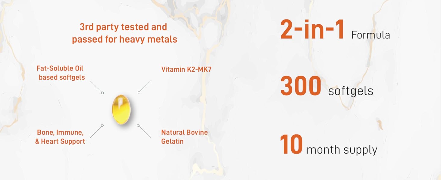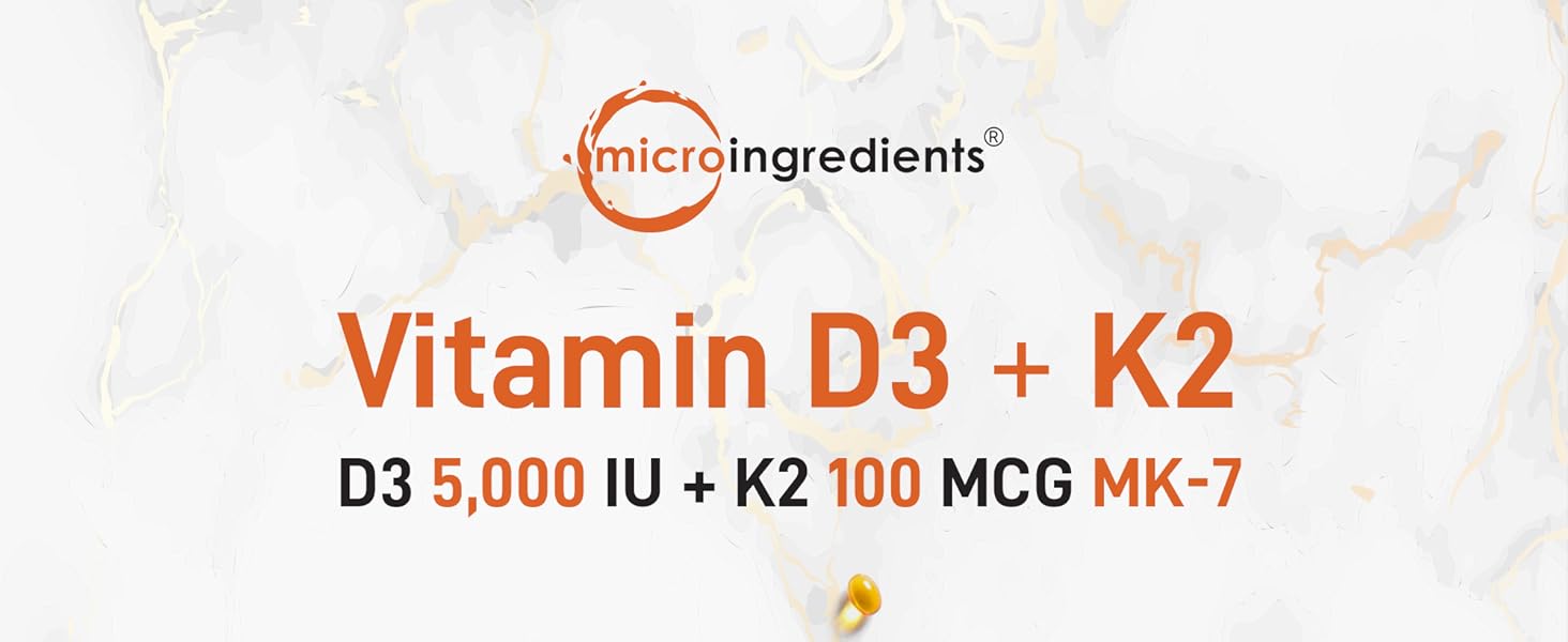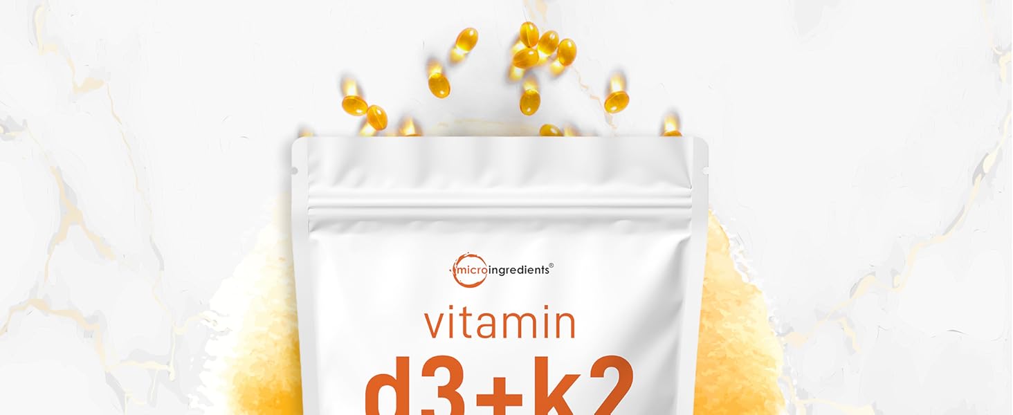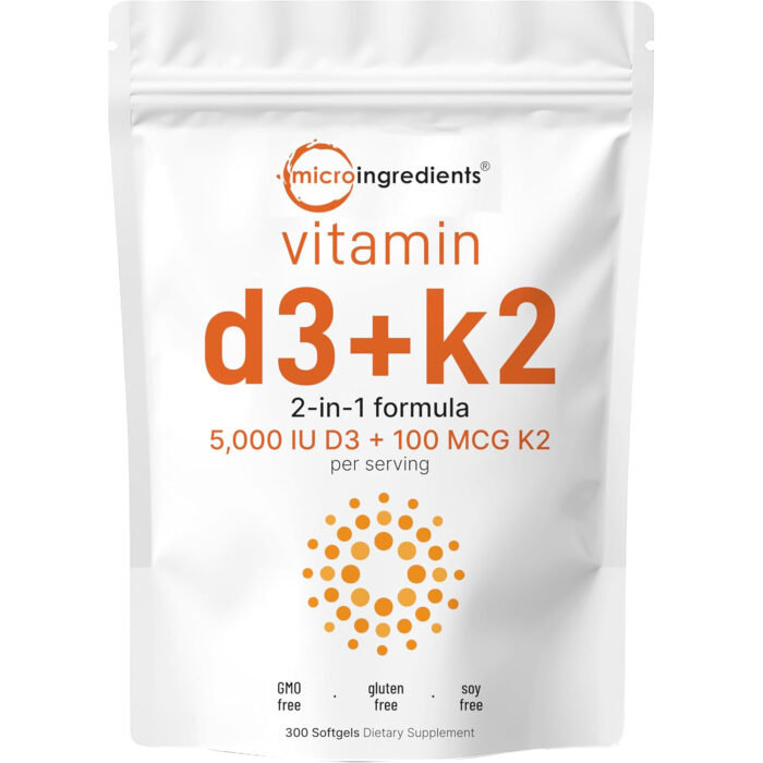 Micro Ingredients Vitamin D3 5000 IU with K2 100 mcg, 300 Soft-Gels | K2 MK-7 with D3 Vitamin Supplement, 2 in 1 Support Immune, Heart, Joint, Teeth & Bone Health – Easy to Swallow